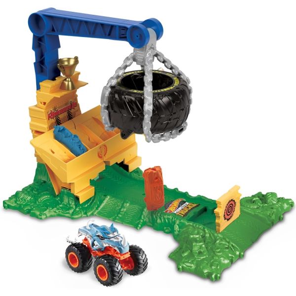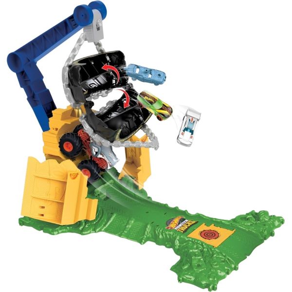 Contiene: 1 pista Hot Wheels Monster Trucks Arena Smashers Rhinomite Chargin' Challenge, 1 Hot Wheels Monster Trucks Rhinomite y 2 autos aplastados