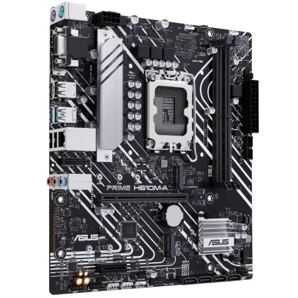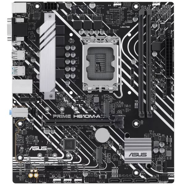La placa madre Asus Prime H610M-A es ideal para aquellos que buscan un excelente rendimiento y potencia en su sistema. Con su formato Micro-ATX, se adapta perfectamente a una amplia variedad de chasis, ofreciendo una gran flexibilidad en términos de instalación y configuración. Iluminación RGB Aura Sync, encabezados direccionables Gen 2 integrados y encabezado Aura RGB para tiras LED RGB, fácilmente sincronizables con hardware compatible con Aura Sync.Especificaciones:Factor de Forma: Micro ATXSocket de procesador: LGA 1700Memoria RAM: 2 x DIMM DDR5, Max. 96 GB, 5600, 5400, 5200, 5000, 4800 Memoria sin búfer y sin ECC.Soporta procesadores: Intel Core de 13.ª generación e Intel Core de 12.ª generación, Pentium Gold y Celeron.Chipset: Intel H610Almacenamiento: 2 x M.2, 4 x SATA 6 Gb/sAudio: CÓDEC de audio de alta definición con sonido envolvente Realtek 7.1Slot de expansión: 1 x PCI Express 4.0 x16, 1 x PCI Express 3.0 x1LAN: 1 x Ethernet Intel de 1 GbInterfaz:2 x USB 3.2 Gen 2,4 x puertos USB 2.0,1 x DisplayPort,1 x puerto VGA 1 x puertoHDMI,1 x ranura vertical M.2,1 x puerto Ethernet Intel® de 1 Gb, 3x conectores de audio,1 x teclado PS/2 ,1 x mouse PS/2.