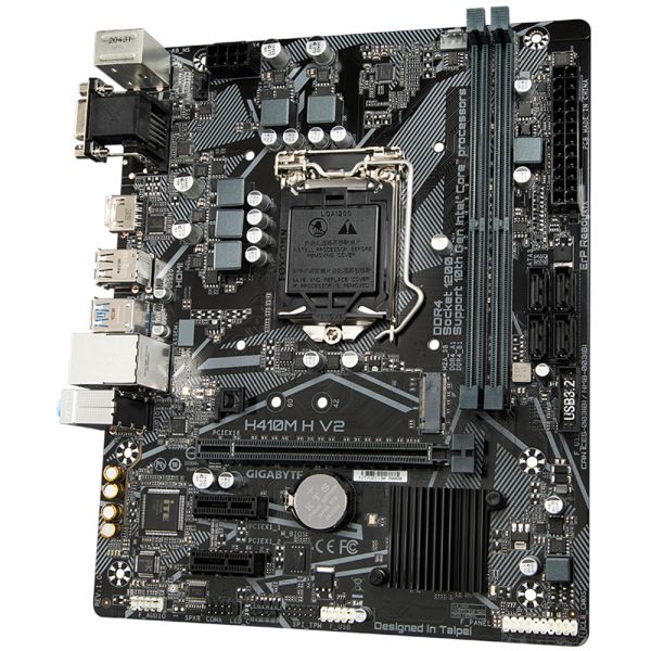 La placa madre H410M H V2 de Gigabyte es una opción ideal para los usuarios que quieren aprovechar los procesadores Intel de 10ª generación. Con dos ranuras de RAM DDR4 de hasta 2933 MHz, cuatro puertos SATA III y un M.2, esta placa madre te ofrece un rendimiento multitarea y de almacenamiento superior.Especificaciones:Factor de Forma: Micro ATXSocket de procesador: LGA 1200Memoria RAM: 4 x DIMM DDR4, 2933 MHz que admiten hasta 64 GB (capacidad de un solo DIMM de 32 GB)Procesadores: Intel Core, Celeron y Pentium 10ª generaciónChipset: Intel H470Almacenamiento: 1 x M.2, 4 x Sata 6 Gb/sAudio: Realtek CODEC de audio, Audio de alta definición, 2/4 / 5.1 / 7.1 canalesSlot de expansión: 1 x PCI Express 3.0 x16, 1 x PCI Express 3.0 x1LAN: Intel GbE LAN chip (1 Gbit/100 Mbit)Interfaz: 1 x PS/2 Teclado/mouse, 1 x D-Sub, 1 x HDMI, 2 x USB 3.2 Gen 1, 4 x USB 2.0/1.1, 1 x RJ-45, 3 x audio jacks