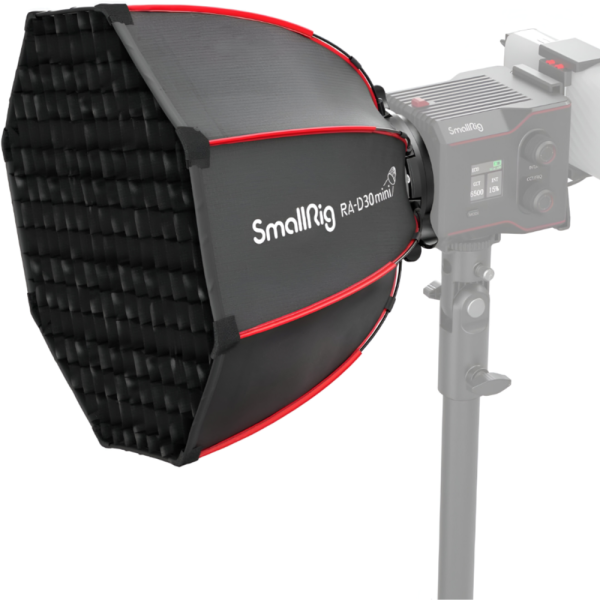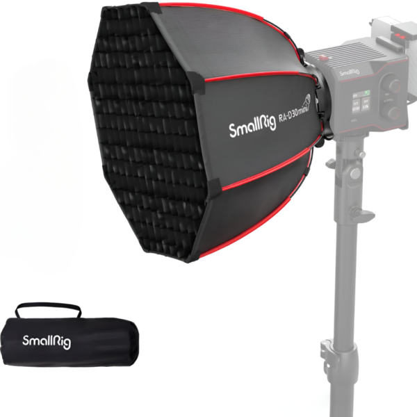 La Softbox SmallRig RA-D30 Mini Parabolic, en color negro, presenta un diseño parabólico compacto, ideal para difundir la luz de manera uniforme en sesiones de fotografía. Es compatible con la luz SmallRig RC 60B, proporcionando un control preciso de la iluminación y mejorando la calidad de las tomas.