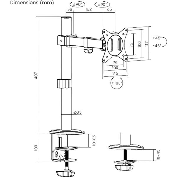 Ángulos de ajuste: ±90° (giro), ±45°(inclinación) y ±180° (rotación)