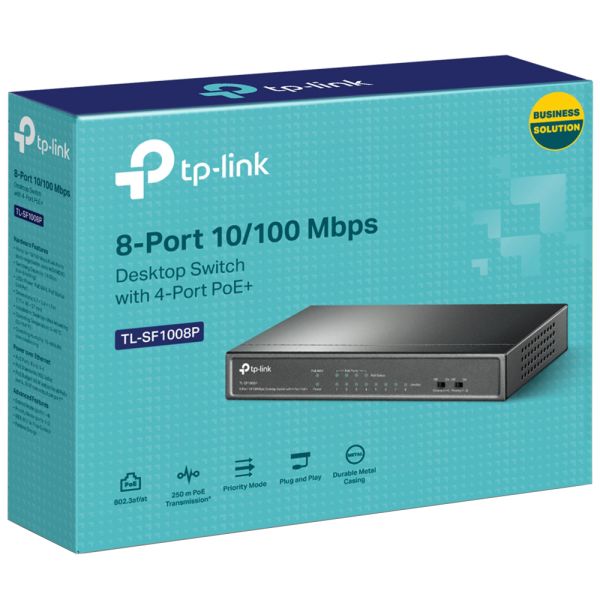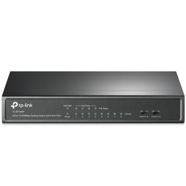 El switch de escritorio TP-Link TL-SF1008P viene equipado con 8 puertos de 10/100 Mbps, de los cuales 4 son puertos PoE o de alimentación a través de Ethernet, lo que permite la transmisión simultánea de datos y alimentación. proporcionada a través de una única conexión Ethernet. Con capacidades de alimentación a través de Ethernet, puede conectar fácilmente puntos de acceso, teléfonos IP y otros dispositivos sin necesidad de una conexión de alimentación dedicada. Además, cuenta con la función de prioridad de puerto, la cual proporciona opciones de mayor prioridad para los puertos 1-2.
