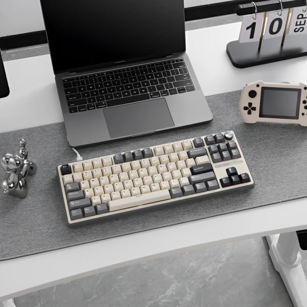 El Teclado Mecánico Royal Kludge RK87 Pro 75% RGB es una joya para los amantes de la tecnología que buscan optimizar su espacio y rendimiento tanto en juegos como en la vida diaria. Este teclado combina diseño, funcionalidad y personalización al más alto nivel. Su diseño compacto TKL (Tenkeyless) permite ahorrar el 25% del espacio del escritorio sin sacrificar teclas esenciales, haciendo que cada sesión de juego o trabajo sea más eficiente. Una de las características más destacadas del RK87 Pro es su perilla de metal CNC intercambiable en caliente que permite controlar el volumen con facilidad, e incluso personalizar el teclado según las necesidades del usuario al poder ser reemplazada por una tecla estándar. Los interruptores ofrecen una experiencia de escritura suave y satisfactoria, ideal para largas sesiones de mecanografía o intensivas jornadas de juego, asegurando una vida útil de 50 millones de pulsaciones. Además, su diseño de montaje con junta y LEDs orientados al sur garantizan una experiencia de escritura silenciosa, suave y visualmente impactante. El soporte para programabilidad QMK/VIA permite una personalización completa, desde la reasignación de teclas hasta configuraciones de iluminación, asegurando que el teclado sea una extensión verdaderamente personal del usuario.