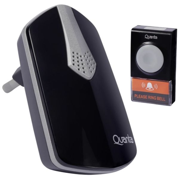 Timbre eléctrico Quanta QTCWE05 alimentado vía toma eléctrica transmisor alimentado por 1 pila 23A 12v, interruptor resistente a agua. Alcance 150 metros cuenta con un volumen ajustable 38 melodías opcionales con soporte para colgar.
