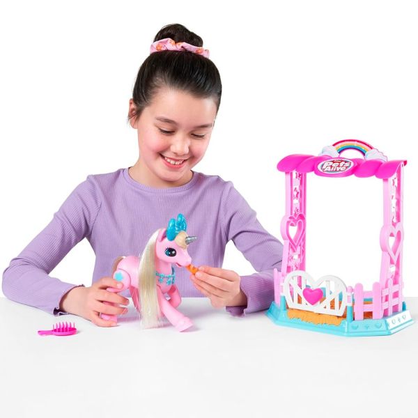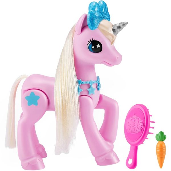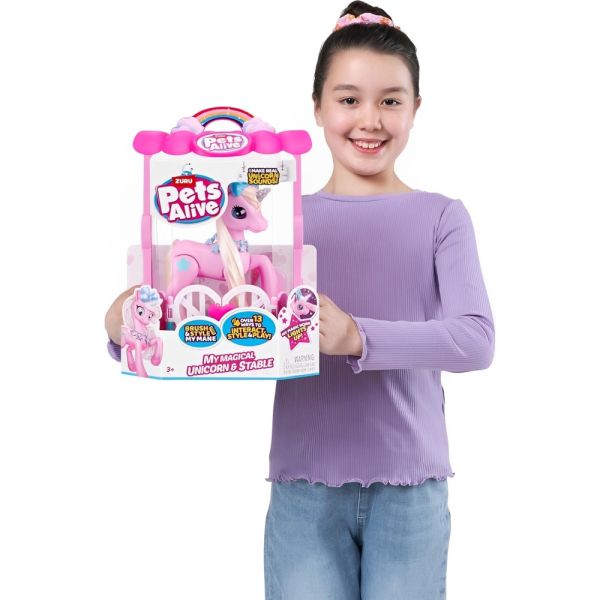 El Unicornio Zuru Pets Alive My Magical Unicorn & Stable 9545 es el regalo perfecto para los pequeños amantes de la fantasía. Está diseñado para ofrecer horas de diversión y aprendizaje, permitiendo que los niños cuiden y jueguen con su propio unicornio mágico. Con más de 13 maneras de interactuar, este unicornio animado es la herramienta ideal para estimular la imaginación. Los niños pueden cepillar y estilizar su melena con el cepillo incluido, alimentarlo con zanahorias y ver cómo su cuerno se ilumina con un brillo mágico, creando una experiencia verdaderamente encantadora. Además, al acariciar su nariz, el unicornio emite sonidos reales, añadiendo realismo al juego. El establo incluido proporciona el refugio perfecto para el unicornio. Este juguete es ideal para niñas y niños que adoran los unicornios y las aventuras mágicas, fomentando el juego creativo y el desarrollo de habilidades motoras finas.