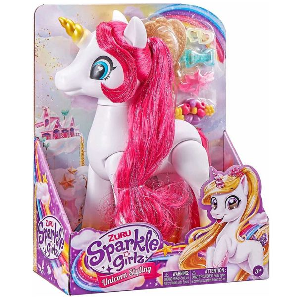 Este unicornio mágico Sparkle Girlz ZU100372 con accesorios, posee cabello largo y suave. Mueve su cabeza de lado a lado para que pueda pararse en diferentes posiciones y puedas peinar su cabello, este juguete viene con un cepillo y un montón de hebillitas para el cabello, proporciona horas de diversión, y también ayuda a desarrollar la creatividad y la imaginación de las pequeñas.