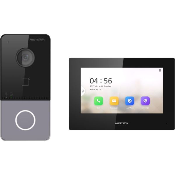El video portero Hikvision DS-KIS605-P posee un diseño amigable con una pantalla de 7 pulgadas, función de monitor y App HikConnect. La cámara proporciona una resolución de 1024 × 600p en la pantalla integrada y 1920 x 1080p en la App, visión nocturna por infrarrojos IR 3m y calidad de audio con supresión de ruido y cancelación de eco. Dispone de conectividad Wi-Fi 2.4 GHz.