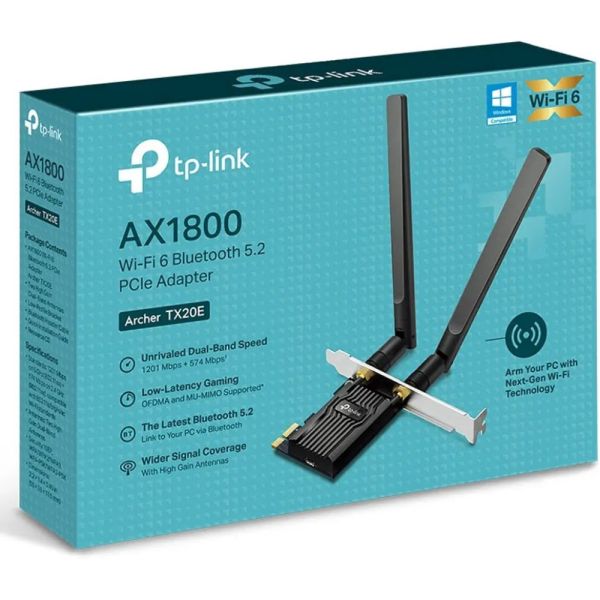 El Adaptador PCIe TP-Link Archer TX20E AX1800 Wi-Fi 6 Dual Band y Bluetooth 5.2 es la solución perfecta para mejorar la conectividad inalámbrica de tu ordenador. Con dos antenas de alta ganancia, chipset Realtek Wi-Fi 6, velocidades de hasta 1201 Mbps en 5 GHz y 574 Mbps en 2.4 GHz, certificaciones CE, FCC, RoHS, y compatibilidad con estándares como IEEE 802.11ax/ac/n/a, este adaptador te brinda un rendimiento excepcional. Además, cuenta con Bluetooth 5.2, disipador de calor integrado, y es compatible con Windows 11/10(64-bit). Mejora tu experiencia en línea con este potente adaptador de TP-Link.