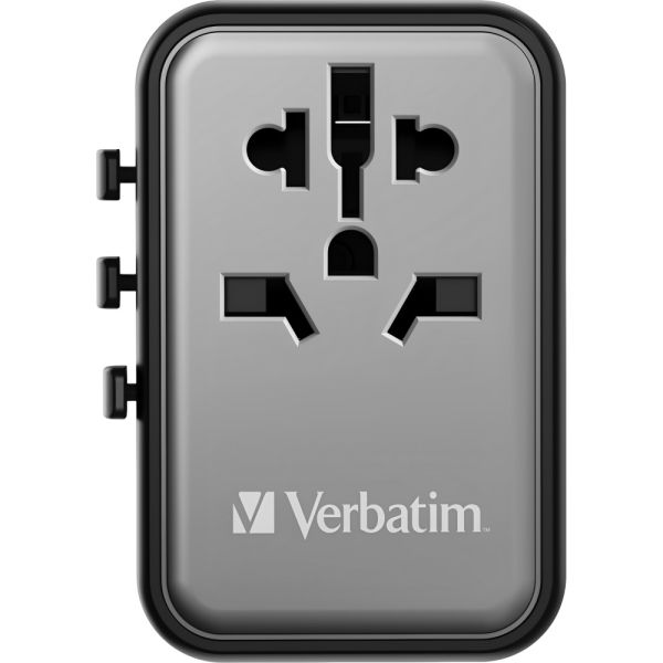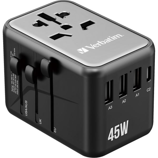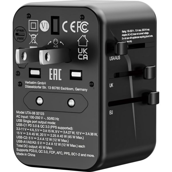 El adaptador universal Verbatim UTA-08 es ideal para viajeros, con compatibilidad en más de 180 países gracias a sus tres deslizadores que ajustan el enchufe a cinco tipos de tomacorrientes. Cuenta con 5 puertos USB (2x USB-C y 3x USB-A) para cargar diversos dispositivos con una potencia total de hasta 45 W. Soporta un electrodoméstico de hasta 2500 W y 10 A. Su material resistente al fuego y el obturador de seguridad garantizan una carga segura.