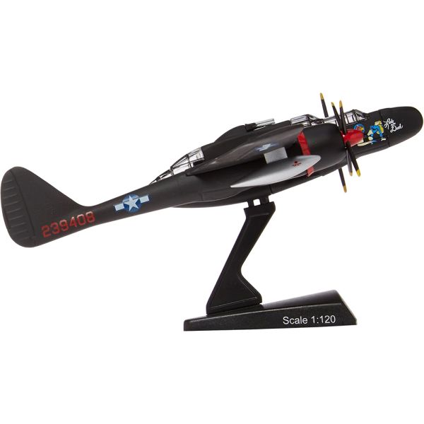 El Northrup P61 Black Widow es un caza bimotor fabricado por Northrup Corporation. Fue utilizado por los escuadrones USAAF de las Fuerzas Aéreas del Ejército de los Estados Unidos durante la Segunda Guerra Mundial. Fue el primer avión de combate estadounidense equipado con un radar aerotransportado y fue diseñado desde el principio como un caza nocturno cuya tarea principal era interceptar a los bombarderos de la Luftwaffe que atacaban Londres por la noche. Este modelo de avión de metal fundido viene en escala 1/120 con soporte de plástico. Sin equipo. El modelo mide aproximadamente 4 3/4 pulgadas de largo con una envergadura de 6 1/2 pulgadas.
