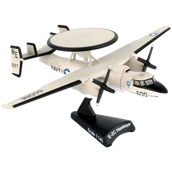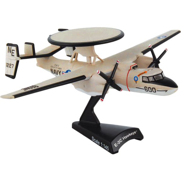 El E-2 Hawkeye es un avión de alerta temprana aerotransportada (AEW) táctico basado en un portaaviones turbohélice gemelo fabricado por Northrup Grumman Corporation. Su exclusivo domo rader de 24 pies de diámetro montado en sus alas se utiliza para la vigilancia marítima y terrestre, para dirigir a los pilotos de combate a sus ubicaciones objetivo, controlar misiones de búsqueda y rescate, retransmitir comunicaciones por radio e incluso como una unidad de control de tráfico aéreo de emergencia. Este modelo de avión de metal fundido a presión viene en escala 1/145 con soporte de plástico y el modelo es aproximadamente 4 1/2 pulgadas de largo con 6 3/4 pulgadas de envergadura.