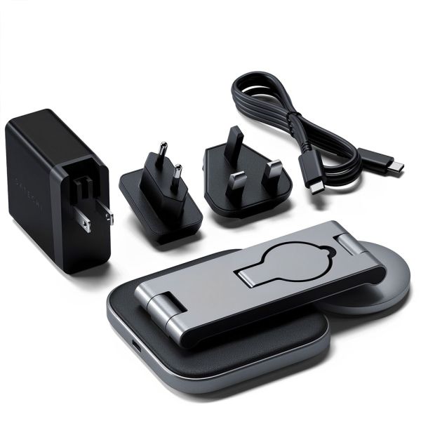 Mantén tus artículos esenciales de uso diario cargados y organizados con el soporte de carga inalámbrica Qi2 plegable 3 en 1 de Satechi. Impulsado por la última tecnología Qi2, puede entregar simultáneamente 15 W de potencia a tu iPhone, 5 W de potencia a tus AirPods y 5 W de potencia a tu Apple Watch. Su diseño plegable y apto para viajes cuenta con una carcasa de aluminio de primera calidad, una base de cuero vegano, un disco de carga de silicona suave y bisagras resistentes y duraderas que no se debilitarán con el tiempo, lo que permite una visualización óptima tanto en modo vertical como horizontal.