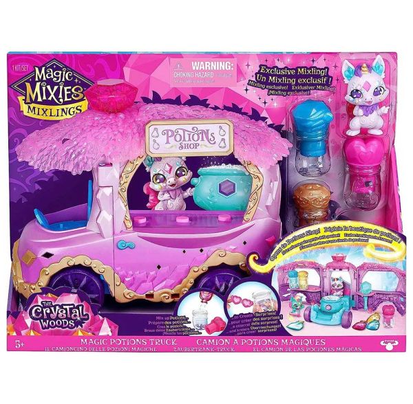 Ahora su hijo puede emprender un viaje mágico a través de The Crystal Woods en el camión de pociones mágicas Magic Mixies. Con abundantes características, este camión encantado se abre y se transforma en una tienda de pociones cuando se presiona la gema mágica, ¡para que los niños puedan comenzar a mezclar pociones en el caldero burbujeante! Pueden usar los ingredientes para mezclarlos en el Caldero y luego hacer una poción para agregar a su hermosa Botella de Poción. Aquí es donde ocurre la magia. Los niños pueden crear sorpresas para su Mixling cuando realizan los hechizos. Los accesorios más lindos para su mezcla aparecerán mágicamente en la botella. Pueden crear una poción de amor (con el accesorio de gafas Love Vision), una poción Lucky Star (con el accesorio Lucky Star) y una poción de vuelo (con la diadema Winged Flight). En el juego Magic Potions Truck se incluye un Mixling exclusivo para que su hijo juegue y lo agregue a su colección!