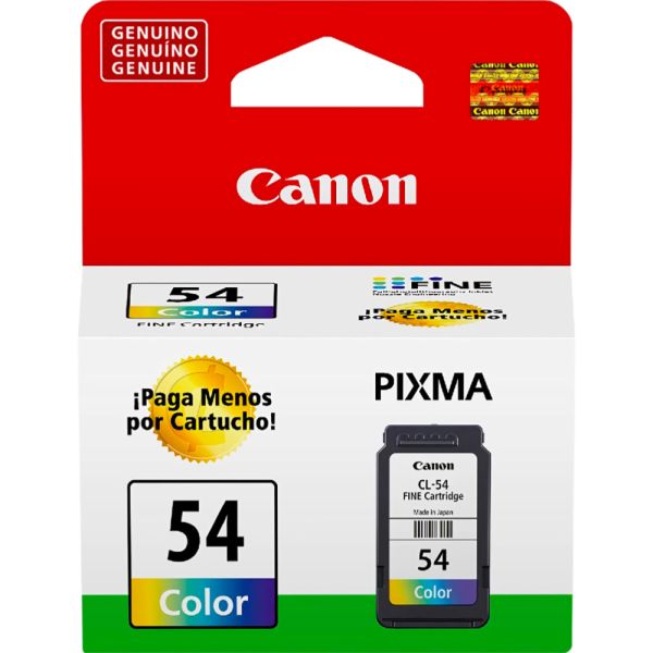 Con el cartucho de tinta Canon CL-54 imprime colores más brillantes y duraderos. Proporciona un rendimiento de 710 páginas y es compatible con impresoras Canon Pixma E401, E461 y E481.