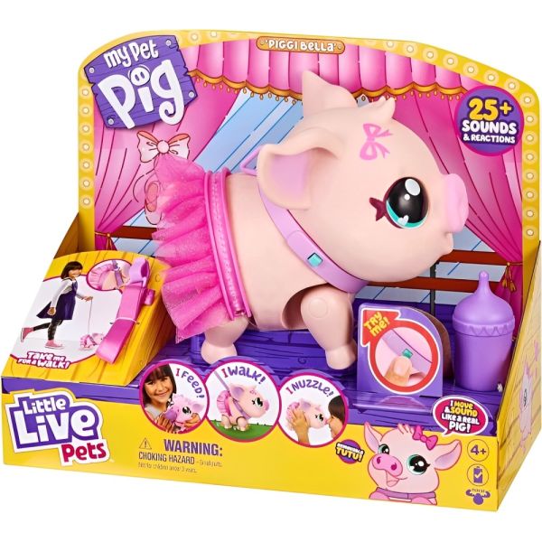 ¡A Piggi Bella le encanta el ballet y se ve hermosa con su tutú brillante y su moño! Con más de 25 sonidos y reacciones, Piggi Bella se mueve y suena como un cerdito real. Dale de comer con su biberón y abrázala mientras reacciona a tu tacto. Levántala y toca tu nariz con su hocico y te dará un dulce beso. Piggy hace muchos sonidos divertidos y dulces: gruñe, se alimenta, se ríe, eructa, huele, estornuda e incluso puede soltar un lindo pedo. Piggi Bella tiene una piel súper suave y orejas caídas que se mueven cuando se mueve. Pasea con ella con su correa o mira cómo se mueve y baila con sus propias melodías musicales. Piggi Bella viene con una correa para caminar desmontable, un biberón, un folleto de instrucciones y se incluyen pilas para que esté lista para jugar contigo.