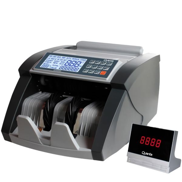 El contador de dinero Quanta QTCDD20 ofrece un contaje preciso, rápido y confiable. Ahorra tiempo y garantiza la seguridad en tus transacciones con esta innovadora herramienta financiera. Tiene funciones de detector de dinero falso con luz ultravioleta y tinta magnética. También detecta billetes dañados. El color de la pantalla se vuelve rojo cuando detecta nota falsa.Especificaciones:Detecta billetes falsos con luz ultravioleta y tinta magnética.Detecta billetes dañados.El color de la pantalla se vuelve rojo cuando detecta nota falsa.Con identificación de tipo de moneda:Real (BR), dólar (US),Guaraní (PY) y euro (EU).2 visores LCD.Velocidad: 1000 billetes / min.Función de cálculo de valor total de billetes.Capacidad de apilado: 200-300 billetes.Consumo: 80 Watts.