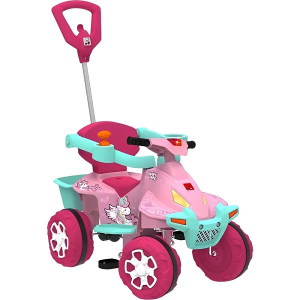 El cuadriciclo infantil Bandeirante Smart Quada Pedal es el compañero perfecto para los más pequeños en sus aventuras al aire libre. Diseñado por la reconocida marca Bandeirante, este cuadriciclo es ideal para niños a partir de 12 meses, soportando un peso máximo de 35 kg, asegurando diversión y seguridad. Con su atractivo color rosa, este vehículo infantil cuenta con un manillar equipado con visor, luz LED y un soporte para botellas de agua o biberones, facilitando la hidratación en el paseo. El respaldo anatómico proporciona un soporte cómodo para los niños, mientras que la varilla orientable y desmontable permite a los padres mantener el control con facilidad. Su sistema de tracción innovador con cardan ofrece una experiencia de pedaleo suave y ágil. Las ruedas con anillos de protección y los reposapiés extraíbles garantizan estabilidad y confort. Además, incorpora un práctico baúl debajo del asiento para guardar objetos esenciales. La seguridad está reforzada con una valla protectora desmontable con apertura lateral. Este cuadriciclo no solo es un juguete, sino una herramienta para el desarrollo motriz y la diversión de los pequeños aventureros.