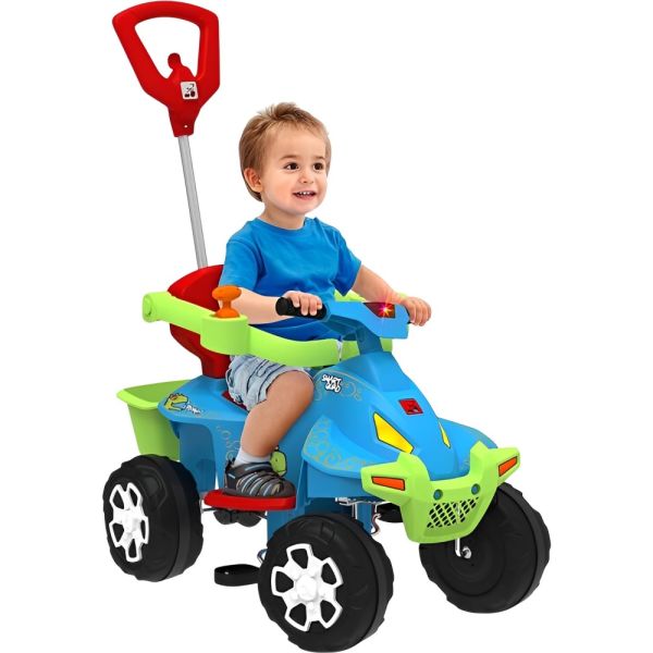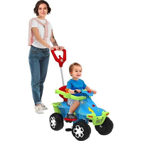 El Cuatriciclo Infantil Bandeirante Smart Quad Paseo y Pedal es el juguete perfecto para niños mayores de 12 meses, ofreciendo una experiencia divertida y segura, tanto para los pequeños como para los adultos. Este cuatriciclo cuenta con dos modos de uso: la función de paseo y la función de pedal. En la función de paseo, los adultos pueden controlar el cuatriciclo fácilmente mediante una varilla orientable, mientras que el niño puede disfrutar del paseo con total seguridad gracias a la carcasa protectora y el cómodo reposapiés. Para los pequeños aventureros, la función de pedal permite al niño pedalear libremente, removiendo la varilla y la protección. El diseño ergonómico incluye un manillar con lente y luz LED, un soporte para botella de agua, y un respaldo anatómico para mayor comodidad. Además, el cuatriciclo cuenta con un sistema de tracción Cardan, lo que proporciona una experiencia de pedaleo más ágil y cómoda.