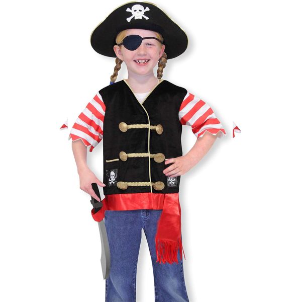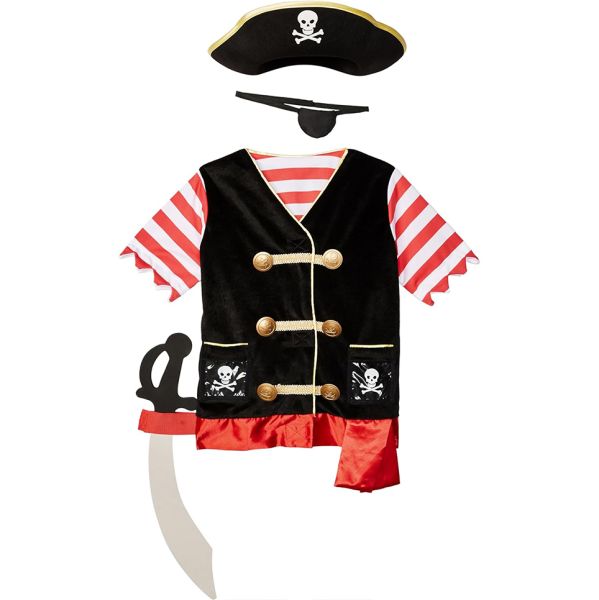 Este conjunto de disfraces de capa y espada dejará volar la imaginación de los niños mientras se disfrazan como un pirata clásico. El conjunto incluye un chaleco bordado con detalles en color dorado, bolsillos profundos para guardar muchos tesoros descubiertos y una faja roja sedosa cosida. También incluye un sombrero pirata de fieltro, un icónico parche en el ojo pirata y una espada blanda. Los materiales de alta calidad garantizan durabilidad y seguridad. Recomendado para niños de 3-6 años.
