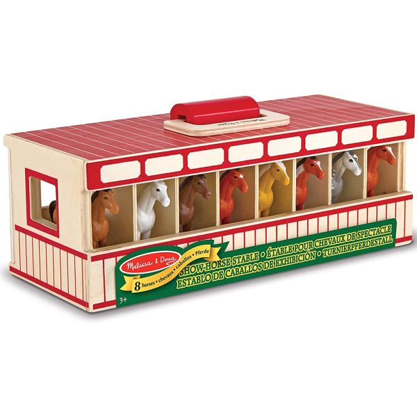 Este bonito establo de madera alberga 8 caballos de juguete, cada uno en su propio establo. Abre las puertas del establo para sacarlos a jugar y luego vuelve a colocar cada uno en su establo hasta el próximo gran espectáculo ecuestre. La robusta caja de madera del establo cuenta con un cómodo asa en la parte superior, un pestillo metálico seguro para niños en las amplias puertas de madera y una guía de razas ilustrada en el panel inferior con información sobre cada caballo. ¡También incluye etiquetas para escribir para que los niños puedan nombrar cada caballo y etiquetar los puestos!