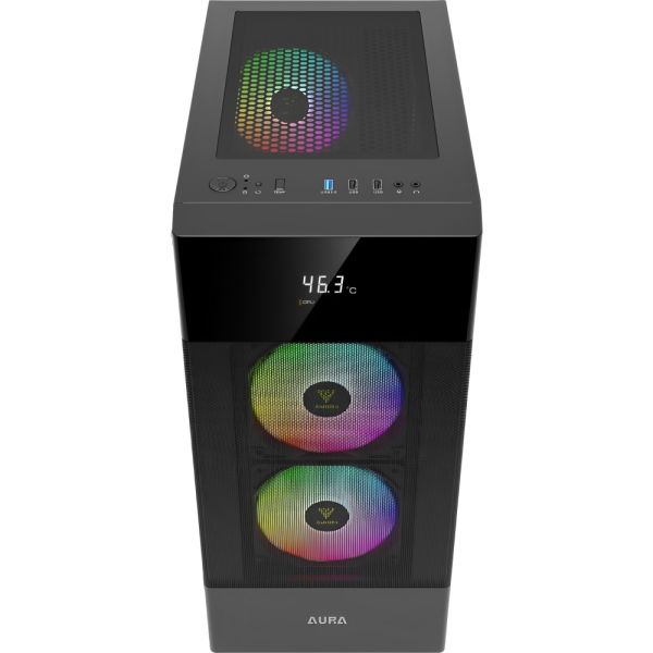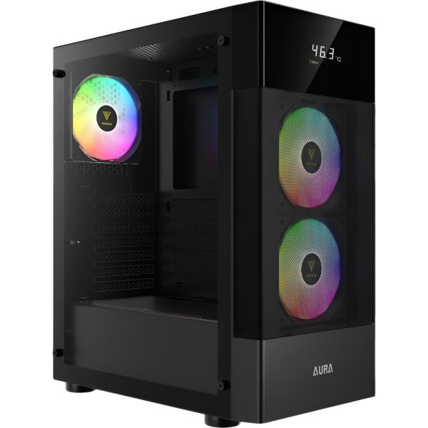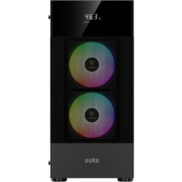 La AURA GC5 combina diseño funcional, estética llamativa y un precio asequible, ofreciendo un gabinete de torre media compacto ideal para configuraciones de gaming o trabajo. Su pantalla digital integrada y los ventiladores RGB fijos preinstalados la convierten en una excelente opción para usuarios que buscan monitoreo en tiempo real y un flujo de aire eficiente.Especificaciones: