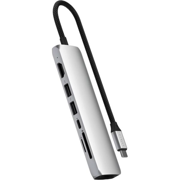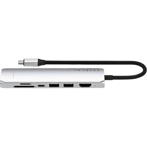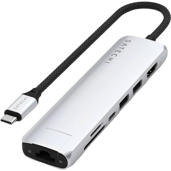 El Hub Satechi Multiport 7 en 1 USB-C en color Silver (modelo ST-P7SS) presenta un diseño elegante y compacto que maximiza la conectividad de dispositivos con puertos USB-C. Este hub cuenta con una amplia variedad de puertos: Ethernet para conexión a internet por cable, HDMI 4K para salida de video de alta calidad, un puerto de carga USB-C Power Delivery con capacidad de hasta 100W, un lector de tarjetas SD y microSD, y dos puertos USB-A. Con una potencia nominal que soporta hasta 100W y tasas de transferencia de datos de alta velocidad de hasta 10 Gbps, este hub es ideal para usuarios que requieren un rendimiento eficiente y ágil. Su diseño portátil lo convierte en una solución perfecta para quienes buscan un accesorio funcional y atractivo para su computadora o dispositivo USB-C, mejorando significativamente su capacidad de conexión y productividad.