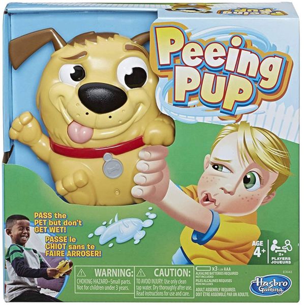 El juguete Peeing Pup es un juego de la ''papa caliente'' en el que los niños se turnan para pasarse el perrito y acariciarle la cabeza hasta que el perrito ladre lo cual indica que es el turno del siguiente jugador. Gana el único jugador que no sea mojado por el perrito.