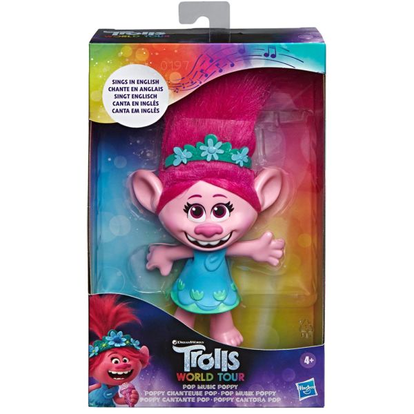 Muñeca de juguete con sonido, presiona el botón en el torso de la figura y ella cantará Trolls Just Want To Have Fun, como lo hace en la película Trolls World Tour. En la secuela de Trolls de DreamWorks, la reina Poppy y sus amigos embarcan en una grandiosa y fantastrolística aventura para salvar la música. Imagina que acompañas a Poppy en una aventura musical, recrea tus escenas favoritas de la película o crea tus propias historias con este juguete musical.