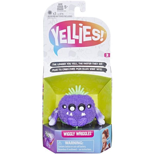 Hasbro Yellies Wiggly Wriggles es un juguete tierno y peludo que tiene su propia apariencia y personalidad única y está llena de divertidas sorpresas. Cuenta con movimiento activado por sonido, responde al hablar, gritar, aplaudir, cantar o incluso escuchar música. Cuanto más fuerte grites, más rápido irá.