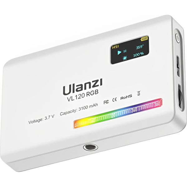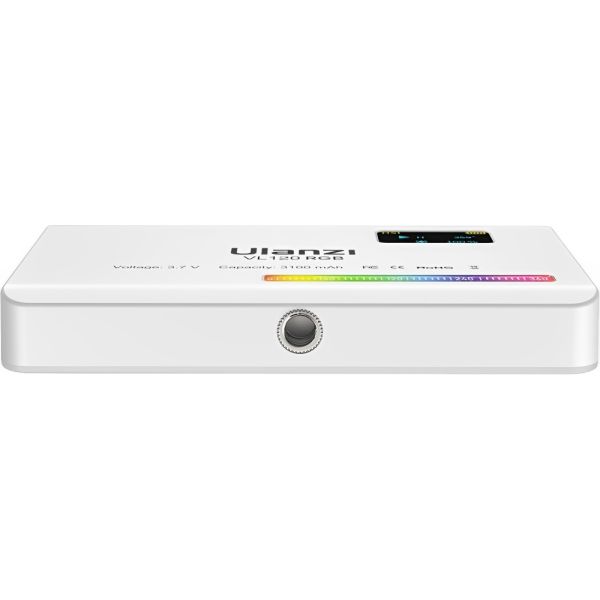 Luz de video LED Ulanzi VL120 RGB tiene un diseño compacto que presenta selección de color RGB, una temperatura de color variable de 2500 a 9000 K, atenuación de 0 a 100 % y 20 efectos de iluminación. Su diseño compacto y ligero te permite llevarla fácilmente en el bolsillo, y la batería integrada de 3100 mAh se carga por completo en aproximadamente 2,5 horas mediante el cable USB tipo C incluido. La luz LED también cuenta con una pantalla OLED, así como una rosca de montaje de 1/4"-20 y un adaptador de zapata fría para montar en tu cámara o equipo. La luz de fotografía Ulanzi VL120 RGB tiene brillo máximo de 1250 LUX (1.0 ft), proporciona buenas condiciones fotográficas para satisfacer tus necesidades de disparo de luz oscura. La batería de litio integrada de 3100 mAh, puede lograr hasta 3 horas de iluminación continua. Carga tipo C, también se puede utilizar mientras se carga.