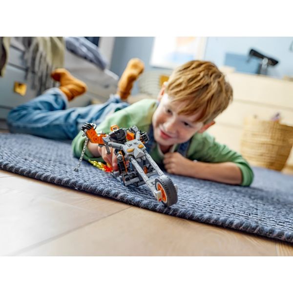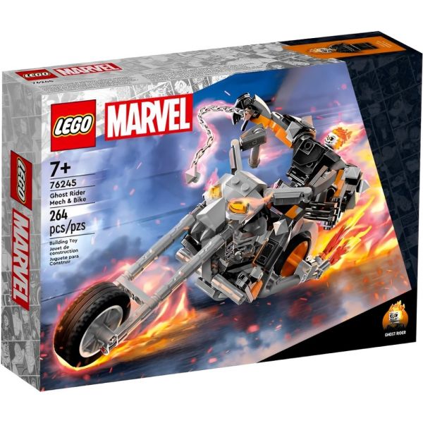 Descubre el emocionante set LEGO Marvel Meca y Moto del Motorista Fantasma (76245), compuesto por 264 piezas diseñadas para liberar la imaginación de los jóvenes superhéroes. Este set ofrece un increíble modelo de un meca móvil sobre ruedas, incorporando una emocionante experiencia de construcción y juego. Incluye una emblemática minifigura del Motorista Fantasma, equipada para pilotar su meca construible, el cual cuenta con brazos, piernas y dedos articulados, permitiendo una amplia gama de poses dinámicas. Además, el set presenta una imponente moto de gran tamaño que mide aproximadamente 10 cm de altura, 30 cm de longitud y 7 cm de anchura, y está diseñada para alojar al meca en su asiento, aumentando las posibilidades de juego. Ideal para niños a partir de 7 años, este set LEGO no solo fomenta el juego imaginativo, sino que también es perfecto para la exposición, convirtiéndose en una pieza destacada en cualquier colección de fans de Marvel.