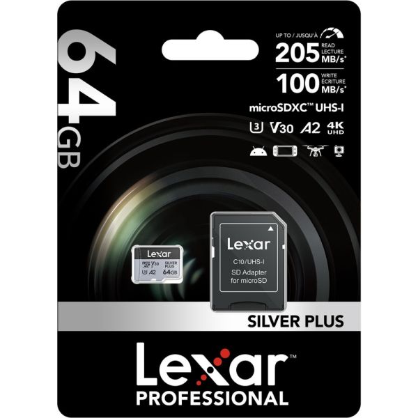 La Memoria Micro SD Lexar Professional Silver Plus 205-100MB/s C10 es la elección perfecta para los profesionales que buscan velocidad y durabilidad excepcionales. Esta tarjeta microSDXC aprovecha el bus UHS-I para admitir grabaciones de video en Full HD y 4K a 60 fps. Ideal para ráfagas de obturador continuo y capturas en formato RAW y JPEG, garantiza que no te perderás ni un solo momento crucial gracias a sus impresionantes velocidades, permitiendo lecturas de hasta 205 MB/s y escrituras de hasta 100 MB/s. Su clasificación de velocidad V30 asegura que las velocidades mínimas de escritura no bajen de 30 MB/s, ofreciéndote confiabilidad en cada uso. Diseñada para resistir condiciones extremas, esta tarjeta es impermeable (clasificación IPX7), resistente al desgaste, a las caídas, a temperaturas extremas, rayos X, golpes, imanes y vibraciones. Incluye un adaptador de microSD a SD, permitiendo su uso en dispositivos SD de tamaño completo.