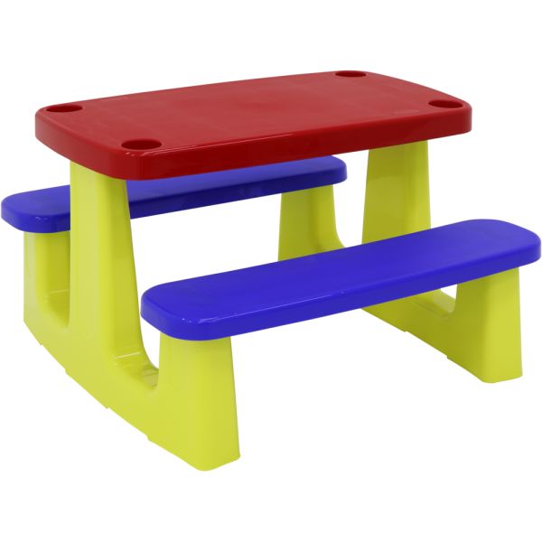 La Mesa Infantil con banco, fabricada de polipropileno libre de materiales tóxicos; es adecuada para la franja de edad de 24 meses en adelante, será una gran aliada para desarrollar las habilidades de los niños. Además, cuenta con porta lápices o vaso.