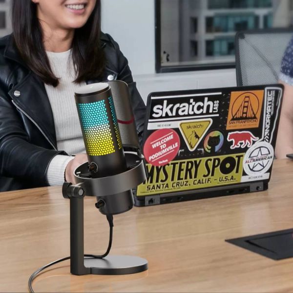 El micrófono de condensador omnidireccional Fifine A9 tiene un diseño compacto de anillo de silicona para reducir la vibración para una mejor grabación. Cuenta con controles de volumen incorporado e interruptor de patrón de recogida para grabación de voz, transmisión y transmisión. Cuenta con cuatro modos de cambio de efecto de iluminación RGB que le brindan una experiencia visual única. Las cápsulas triples integradas de alta fidelidad de 360 grados reciben un sonido claro, suave y neutral. El botón de silencio grande y sensible para aplicar a varios escenarios.Características:Función: cancelación de ruido, micrófono USB, peso ligero, con luz RGB.Material: Metálico.Tipo: Micrófono de condensador, Micrófono de condensador con cable.Frecuencia de muestreo: 44,1 KHz/48 bits.Tasa de respuesta de frecuencia: 50Hz-15kHz.Sensibilidad: -45dB±3dB.Nivel de ruido equivalente: -89dBFS (A-wt).Max.SPL: 115dB (a 1 KHz 1% THD).Uso: Micrófono de escritorio, Escritorio de trabajo, Reunión en línea, Podcasting de juegos, Grabación de música.