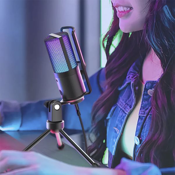 El micrófono cardioide para juegos para PC captura tu voz correctamente, produce un sonido claro, suave y nítido sin ruido estático. Gran regalo para jugadores/transmisores/YouTuber al aislar los sonidos de la fuente principal y separarlos de cualquier ruido de fondo. Con iluminación bicolor, RGB cambia siete modos de color por sí mismo en forma de gradiente. Confiando en un sensor en la parte posterior del micrófono para cambiar el modo de iluminación. El botón de silencio rápido en el frente es conveniente para jugar. Incluso cuando estás concentrado en el juego, puedes silenciar tu micrófono de inmediato. Micrófono de grabación USB Plug and Play con puerto tipo C para computadora portátil que se conecta directamente al puerto USB para grabar música, canto de computadora o podcast. Fácil de usar e instalar. El micrófono externo para computadora portátil tiene el tamaño perfecto para no ocupar demasiado espacio en su escritorio. Con el soporte de trípode plegable y desmontable, el micrófono streamer es lo suficientemente portátil cuando tienes que empacar el micrófono para el estudio. Gire fácilmente el micrófono o inclínelo hacia arriba y hacia abajo.