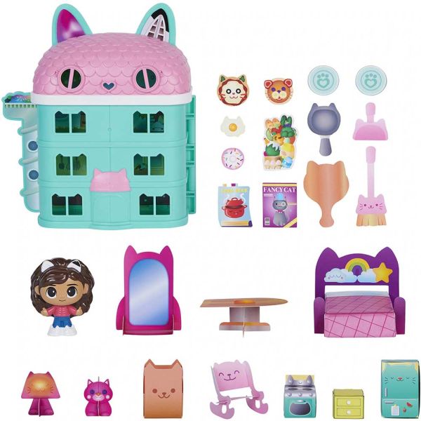 Con más de 18 cm de alto, esta mini casa de muñecas portátil de 2 pisos se abre para revelar dos áreas para jugar tus aventuras inspiradas en la serie de Gabby. Con dos láminas de cartón con diseños de muebles, ensambla todos los accesorios favoritos de Gabby, como su cama con temática de gatito, su refrigerador, estufa, gabinetes y mucho más. Incluye: 1 juego de casa de muñecas, 1 figura de Gabby, 2 tarjetas de muebles Chip Art, 1 hoja de pegatinas.