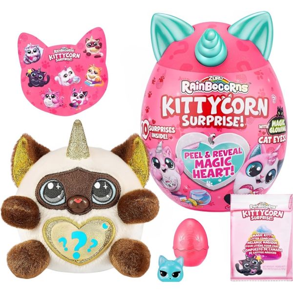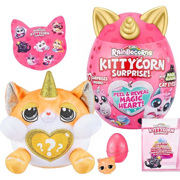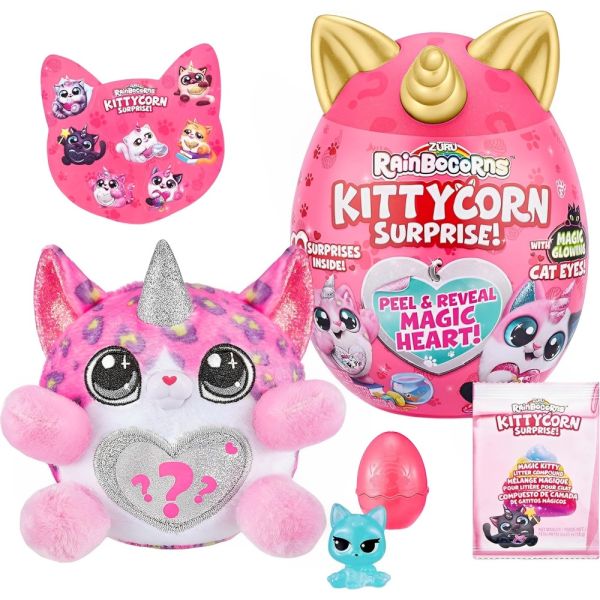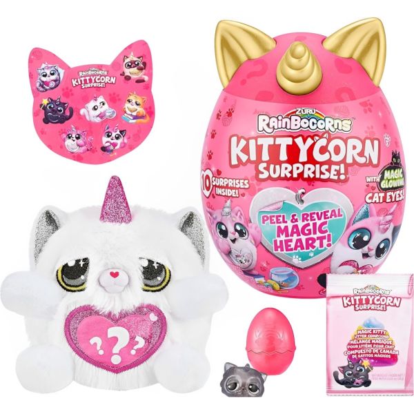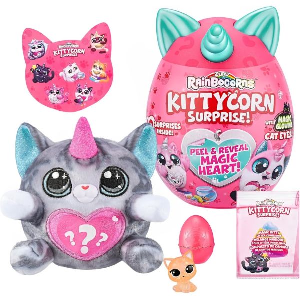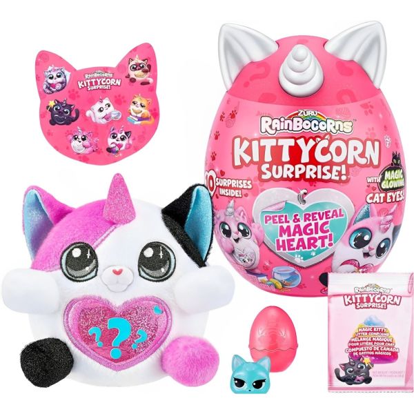 Conoce a los gatitos más lindos de Rainboville con el Mini Huevo de Unicornio Zuru Rainbocorns Kittycorn Surprise. Este adorable y abrazable Kittycorn está repleto de sorpresas tan asombrosas que querrás tenerlos todos. Abre el huevo para revelar el que te tocó, completo con stickers, una guía de coleccionista, popo de Rainbocorns y unos mini-gatitos Boo-Boocorn tan lindos. Pela el corazón de tu Kittycorn para descubrir lo que aman y apaga las luces para ver cómo sus ojos de gatito brillan en la oscuridad. Llena de personalidad, esta Kittycorn no puede esperar para ser tu nuevo amigo peludo.