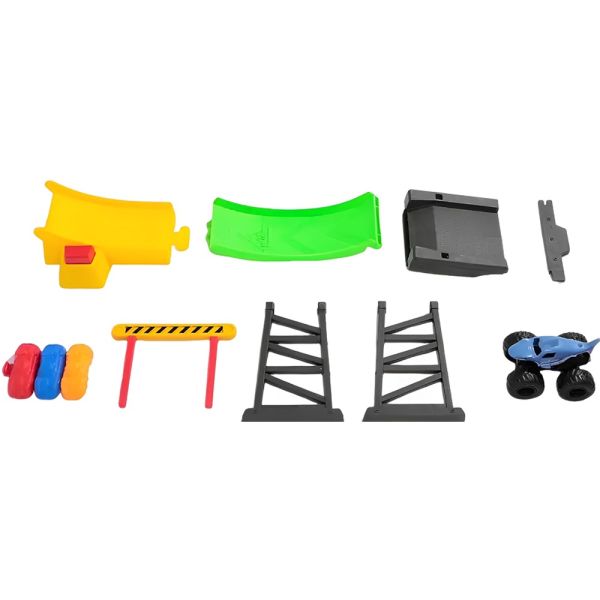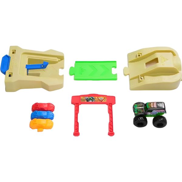 Contiene: 1 camión Monster Jam, 1 lanzador o rampa (es aleatorio) y 3 obstáculos