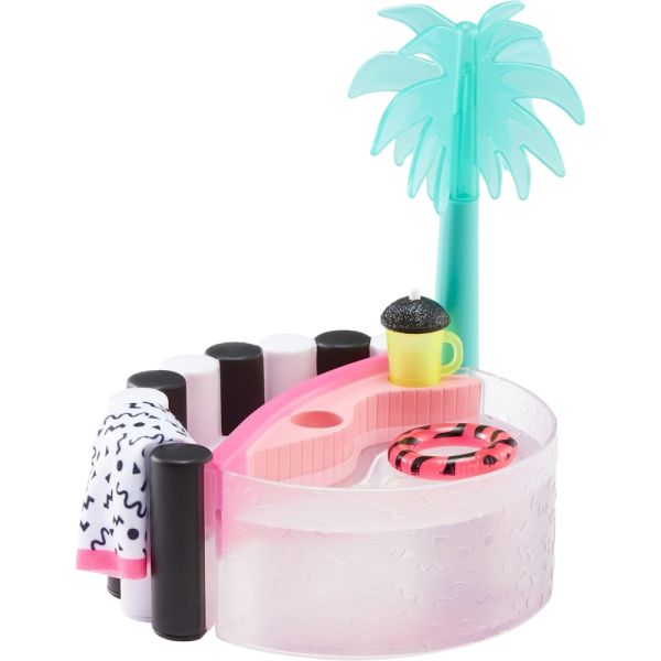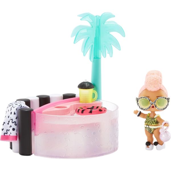 Muñeca L.O.L. Surprise! House Of Surprises Hot Tub con 8 sorpresas, incluyendo una muñeca exclusiva, una bañera de hidromasaje, una palma desmontable, una toalla de playa, un tubo salvavidas, protector solar, un atuendo y una botella. Es un conjunto hecho especialmente para añadir diversión y creatividad a la experiencia de juego.