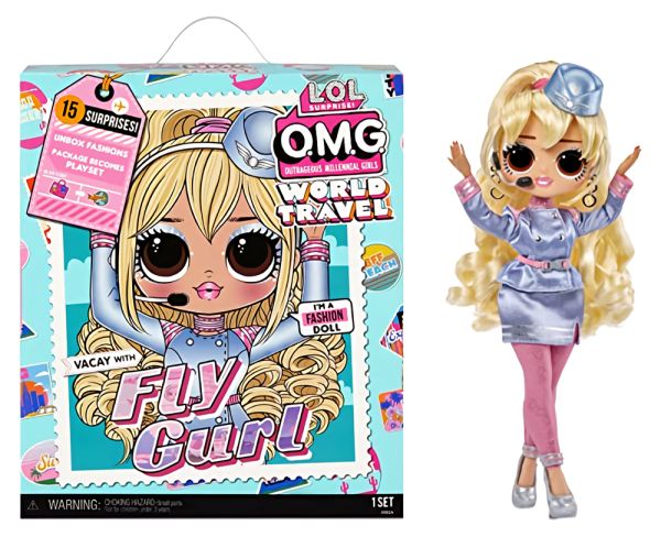 Muñeca LOL Surprise OMG World Travel Fly Gurl con 15 sorpresas para descubrir. Tiene moda y accesorios con temática de viaje. Cuenta con facciones asombrosas, cabello estilizado, empaque reutilizable y un cuerpo articulado para diferentes poses y posturas. Es un regalo ideal para niñas de 3 años en adelante, ya que pueden imaginar sus propias aventuras y jugar de manera creativa.