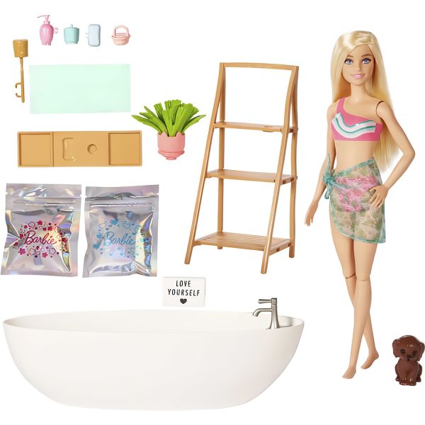 Este juego de Barbie es una forma divertida y colorida de disfrutar de un relajante tiempo de baño imaginativo. La muñeca es flexible y posable, con 7 puntos de articulación que le permiten moverse de manera realista. Viene con cabello rubio lacio y un traje de baño complementado con un pareo transparente, lista para sumergirse en la diversión. El set incluye dos bolsas de jabón de confeti en colores rosa y azul que cambian el agua del baño al mismo color. Estas bolsas son resellables, por lo que se pueden guardar para futuras sesiones de juego.Además de la muñeca, el set incluye una bañera, una bandeja de baño, una estantería, una toalla, un cepillo grande y uno pequeño, una botella de loción, un jabón, una planta, una vela, un letrero y un cachorro. Estos accesorios variados ayudan a crear diferentes escenarios para una narración imaginativa y añaden realismo al juego. La estantería y la bandeja de baño están diseñadas para enchufarse fácilmente, lo que las hace más resistentes y duraderas durante el juego.Observación:La muñeca no puede mantenerse en pie por sí sola. Los colores y la decoración pueden variar.