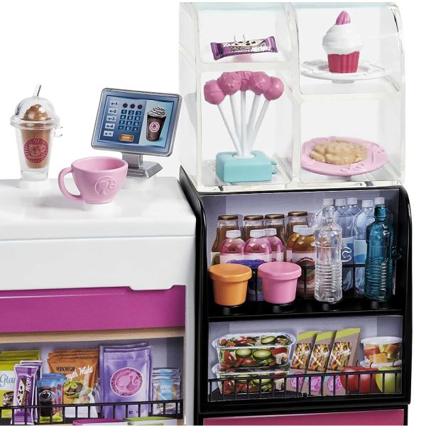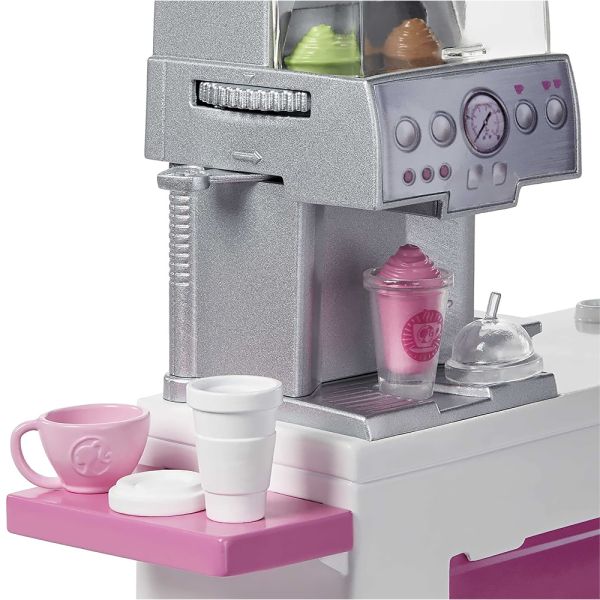El juego Cafetería de Barbie es un gran regalo para niñas de 3 años en adelante, ya que pueden imaginar sus propias aventuras y combinar los accesorios de cafetería para jugar de manera creativa. Con una blusa a rayas, un delantal rosa y el cabello recogido en un moño, Barbie prepara cafés, batidos y tés (gira la rueda en la cafetera para elegir la bebida que desee).Incluye:Cafetería, una muñeca Barbie y más de 20 accesorios.