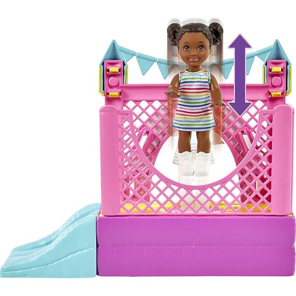 Explora el mundo del cuidado de niños con el juego de castillo inflable Barbie Skipper Baby-Sitter. En este emocionante conjunto, los niños pueden ser niñeros por un día junto a Skipper y el bebé, disfrutando de un parque infantil con un colorido castillo inflable arcoíris, tobogán, columpio, piscina de bolas en forma de corazón y triciclo. No hay tiempo para aburrirse con tantas opciones de juego.El juego incluye un muñeco de Skipper, un bebé al que cuidar y todos los accesorios necesarios para pasar momentos divertidos desde la mañana hasta la noche. Con refrigerios, anteojos de sol, protector solar y botellas de agua, los niños pueden recrear situaciones realistas mientras cuidan del bebé. Skipper y el bebé vienen vestidos con lindos atuendos coloridos y cómodos zapatos, listos para la diversión. Con esta caja, los niños a partir de 3 años pueden experimentar el placer de cuidar a los más pequeños y crear tiernas y divertidas historias de juego. Deja volar la imaginación y sumérgete en el mundo del cuidado de niños con Barbie Skipper Baby-Sitter.Observación:Las muñecas no se sostienen solas. Los colores y las decoraciones pueden variar.