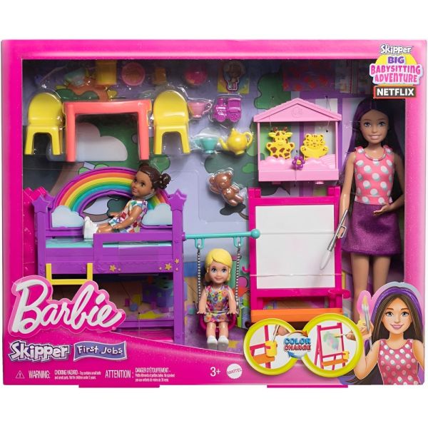 La Muñeca Mattel Barbie Skipper First Jobs Día de Cuidado (HND18) es el regalo perfecto para estimular la imaginación y creatividad de las niñas a partir de los 3 años. Este fascinante set de juego, inspirado en la emocionante película "Skipper y su gran aventura como niñera", permite explorar el mundo laboral con la hermana adolescente de Barbie, Skipper, como protagonista. El set incluye más de 15 accesorios temáticos que transforman cualquier espacio en una guardería de ensueño. Entre las divertidas actividades, las niñas pueden pintar en el caballete, disfrutar de una taza de té en la mesa, montar un espectáculo inolvidable de marionetas, columpiarse, deslizarse y luego descansar en las acogedoras literas. Los muebles y accesorios variados permiten una experiencia de juego versátil, ideal para horas de entretenimiento educativo.