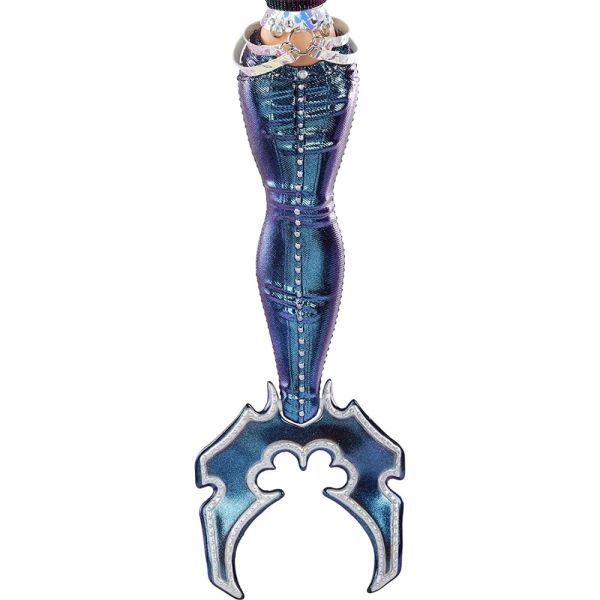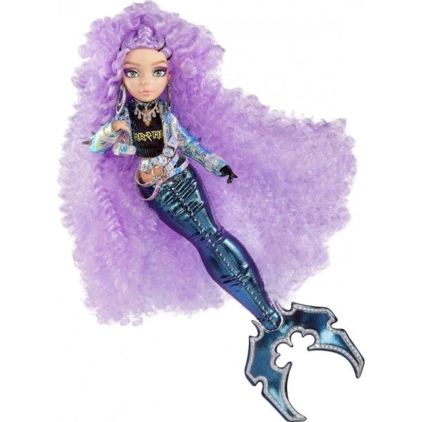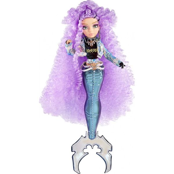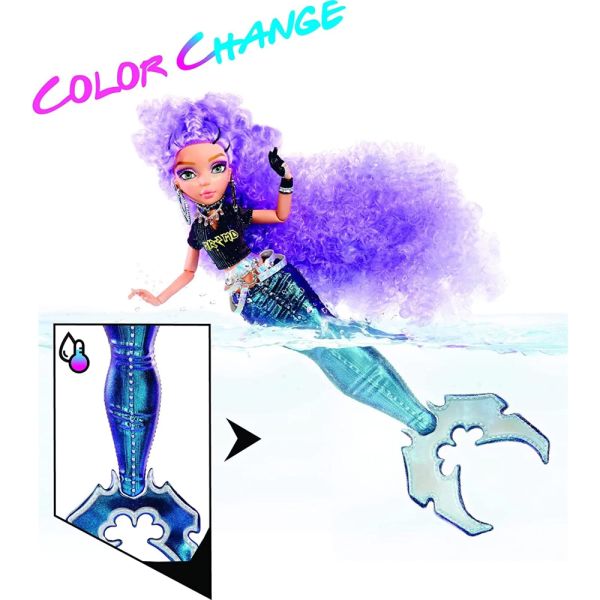 La muñeca Sirena Mermaze Mermaidz Color Change Riviera, de 34 cm, ofrece una experiencia mágica con su cola esculpida que cambia de color. Cuando se sumerge en agua tibia, su cola pasa de un azul oscuro a un verde azulado, y revela destellos plateados al contacto con agua fría. Además, su cola también funciona como soporte cuando la aleta se dobla 90 grados, permitiéndole sostenerse por sí misma. Con puntos de articulación en el cuello, hombros, codos, muñecas, torso, cintura y aletas, esta sirena puede adoptar numerosas poses. Su hermoso cabello morado rizado, ojos de cristal y pestañas reales, junto con su maquillaje de fantasía con toques morados y pecas brillantes, la hacen deslumbrante. Viste una reluciente camiseta de la banda MRMD, una chaqueta de piel sintética iridiscente con detalles de púas, un cinturón de arnés iridiscente, y accesorios como aretes, dos collares y una guitarra eléctrica violeta, completando su look único y fascinante.
