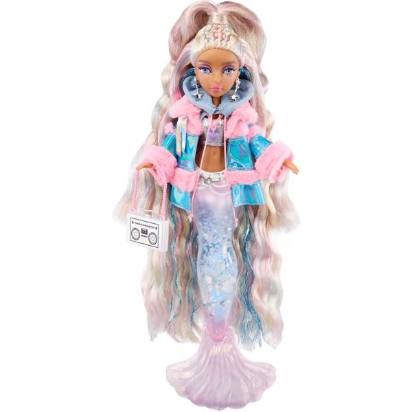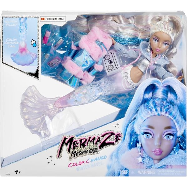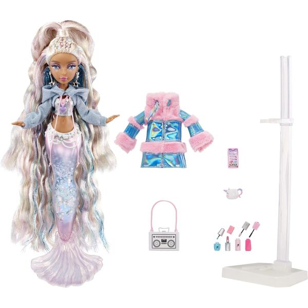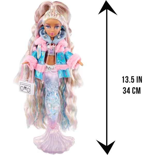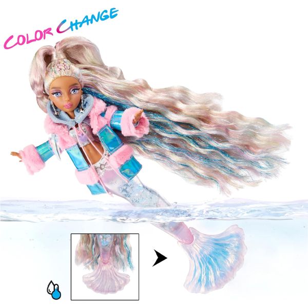 La muñeca Sirena Mermaze Mermaidz Color Change Winter Waves Kishiko ofrece una experiencia mágica con su cola llena de glitter, que se mueve al girarla hacia arriba y hacia abajo. Su aleta cambia de color cuando se sumerge en agua helada, pasando de plateado a un encantador rosa y azul. Kishiko viste una camiseta sin mangas metálica, una sudadera con capucha corta de manga larga y una chaqueta brillante con piel sintética rosa. Sus accesorios incluyen aretes con forma de estrella, un collar con dijes y un bolso cruzado inspirado en un mixtape, además de nuevos accesorios como un teléfono "ostra", una taza y maquillaje. Con puntos de articulación en el cuello, hombros, codos, muñecas, torso, cintura y aletas, Kishiko puede adoptar numerosas poses. Tiene un hermoso cabello largo y multicolor, peinado con la mitad hacia arriba y rizos largos y sueltos, así como preciosos ojos con incrustaciones de cristal y pestañas reales. Su maquillaje glamuroso incluye sombra de ojos rosa. Incluye un soporte para muñecas, ideal para exhibirla con elegancia.