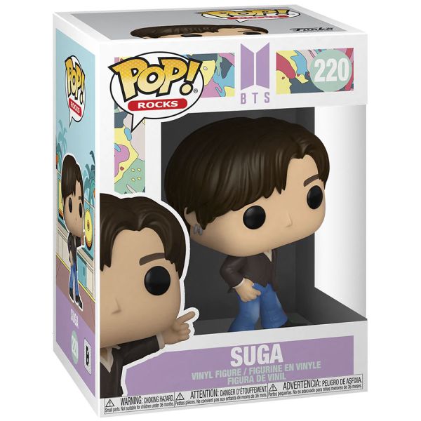 Muñeco Funko Pop hecho de vinilo con una altura aproximada a 10 cm. Llega Suga Dinamite uno de los componentes del grupo surcoreano BTS. En esta figura podemos ver a Suga con unos pantalones azules, zapatos negros, cinturón negro, camisa blanca, chaleco negro y un blazer negro. Imprescindible para todos fanáticos del grupo surcoreano.