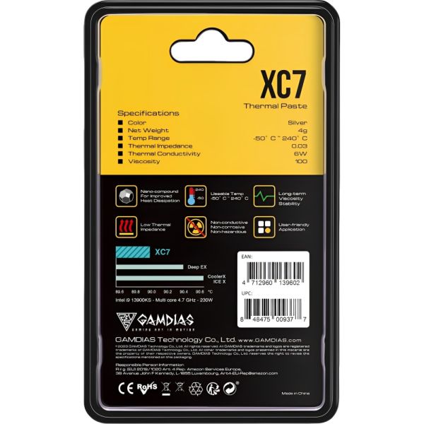 La Pasta Térmica Gamdias XC7 es una solución térmica avanzada diseñada para ofrecer la máxima eficacia en la transferencia de calor, esencial para aquellos que buscan mantener su PC funcionando en condiciones óptimas. Esta pasta térmica cuenta con una alta conductividad térmica de 6 W y una baja impedancia térmica de 0.03°C -cm²/W, lo que garantiza que el calor se disipe de manera eficiente desde la CPU hacia la placa base. Fabricada con un material de base nanocompuesto, el Gamdias XC7 rellena eficazmente las microfisuras para maximizar la superficie de contacto térmico. Su no conductividad eléctrica añade un nivel adicional de seguridad en su aplicación, evitando riesgos de cortocircuitos. Además, su rango de temperatura de funcionamiento de -50℃ a 240℃ hace que sea ideal para diversas aplicaciones, desde PCs de gaming hasta estaciones de trabajo intensivas.