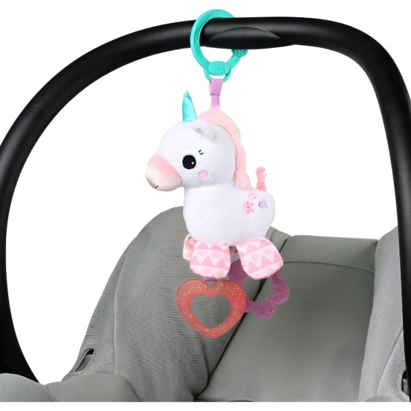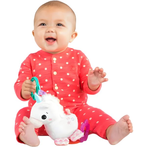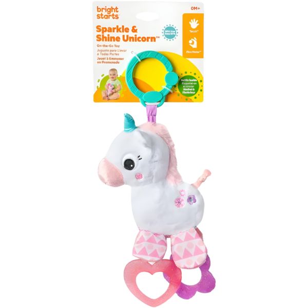 Descubre la magia con el peluche colgante Bright Starts Sparkle & Shine Unicorn. Este encantador compañero, con su divertido y colorido diseño, es perfecto para estimular los sentidos de la vista, oído y tacto de tu bebé desde los 0 meses en adelante. Fabricado con un 65% de tela y un 35% de plástico, este unicornio de peluche es más que un juguete; es el corcel de confianza en el cuento de hadas de tu pequeño. Sus dimensiones compactas de 36 x 14 x 7.6 cm lo hacen ideal para llevar a todas partes. Con dos anillos de dentición brillantes, el Sparkle & Shine Unicorn proporciona alivio al dolor de encías de manera mágica. Su suave melena de Taggies satinados invita a caricias reconfortantes, mientras que agitarlo emite suaves sonidos de cascabel, agregando una dimensión auditiva encantadora. El enlace de fijación incluido permite transformar cualquier portabebés o cochecito en un paseo digno de una princesa y su amigo unicornio. Este juguete para llevar es compatible con la mayoría de los portabebés y cochecitos, convirtiéndolo en el compañero perfecto para las aventuras diarias. Acompaña a tu bebé a donde quiera que vaya con este unicornio de peluche lleno de magia. Además, su diseño oculta cuentas en su interior, emitiendo divertidos sonidos de cascabel y ofreciendo una experiencia sensorial completa. Haz que cada momento sea mágico con Bright Starts Sparkle & Shine Unicorn, el juguete ideal para estimular el desarrollo y la diversión de tu pequeño.