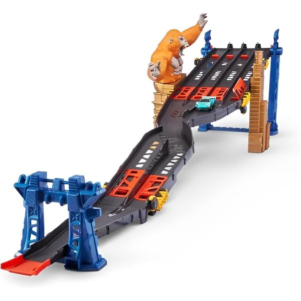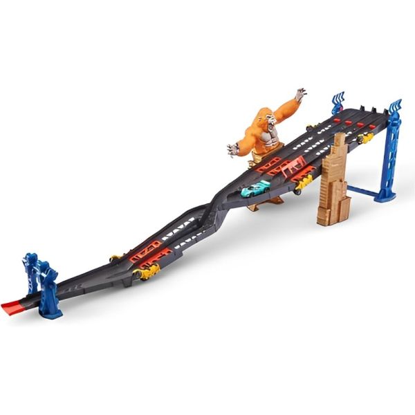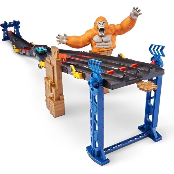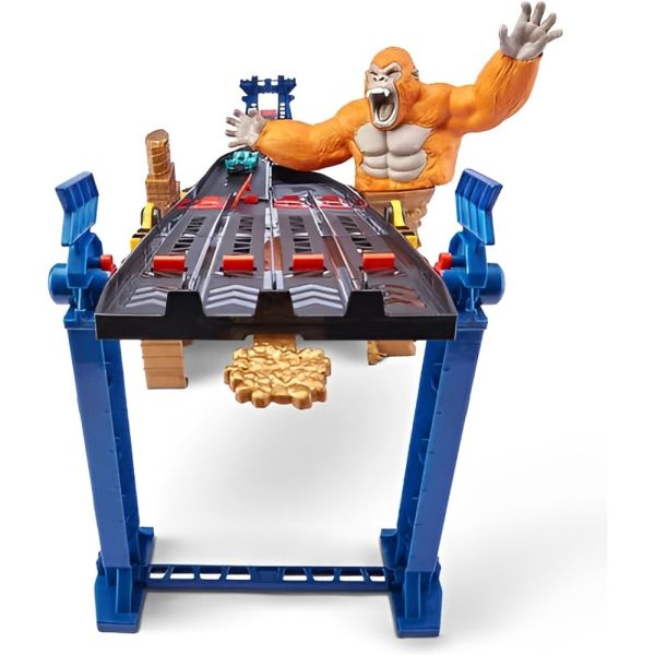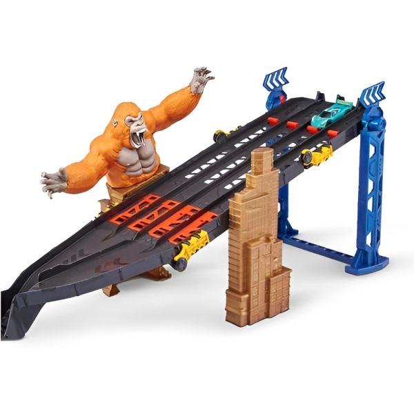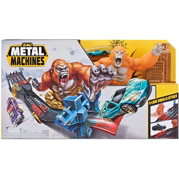 Una locura absoluta de 4 carriles. Cuidado con el Gorila atacante. Si su Metal Machines es lo suficientemente rápido para escapar del ataque del Gorila, hay más obstáculos esperando. Ciudado con las 2 trampas eyectoras ocultas a lo largo de la pista. Más de 1,22 mts de bajada apta para carreras, así como un exclusivo auto metálico fundido a presión.